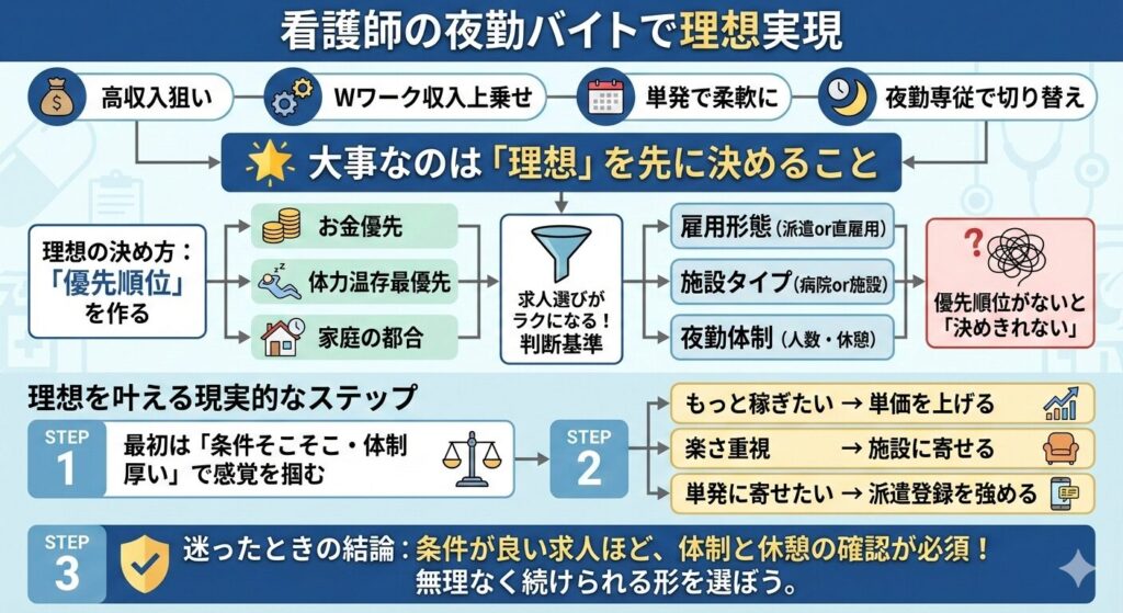 看護師の夜勤バイトは、高収入を狙えるだけじゃなく、Wワークで収入を上乗せしたり、単発で柔軟に入ったり、夜勤専従で働き方を切り替えたりと、選択肢が広いのが強みです。大事なのは、あなたにとっての「理想」が何かを先に決めることです。ここが決まると、求人選びがめちゃくちゃラクになります。